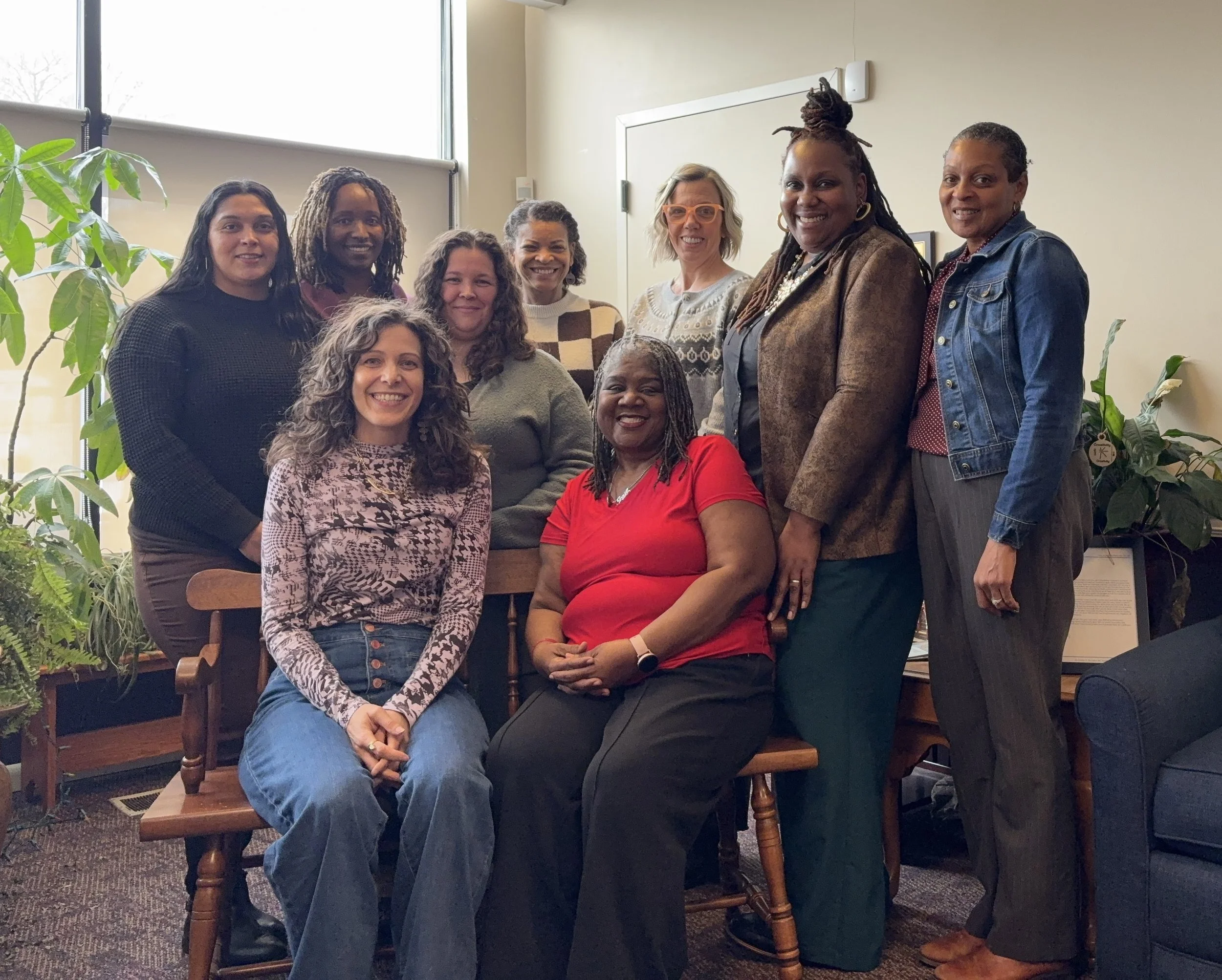Top row, from left to right: Sarita (After Care Manager), Aisha (Program Assistant), Becky (Prevention Case Manager), Monica (Housing Search Navigator), Kim Hunt-Uzelac (Executive Co-Director), Lateisha (Family Stabilization Manager Social Worker), Sonya (Referral Coordinator)